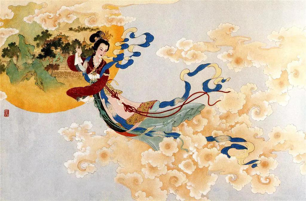 嫦娥吞下藥,身子立時飄離地面、沖出窗口,向天上飛去。由于嫦娥牽掛著丈夫,便飛落到離人間最近的月亮上成了仙。