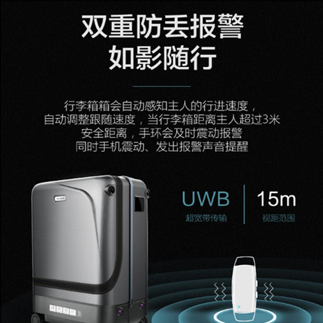 行李箱會(huì)自動(dòng)感知主人的行進(jìn)速度,自動(dòng)調(diào)整跟隨速度,當(dāng)行李箱距離主人超過(guò)3米安全距離,手環(huán)會(huì)及時(shí)震動(dòng)報(bào)警,同時(shí)手機(jī)震動(dòng),發(fā)出報(bào)警聲音提醒。